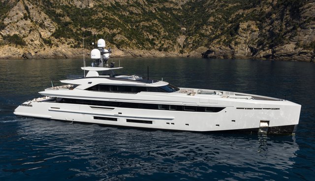 Large windows across the hull and superstructure increase natural light inside while emphasizing the yacht’s gross tonnage of 496 GT. A pronounced strake and horizontal glazing bands give the profile structure without visual heaviness.