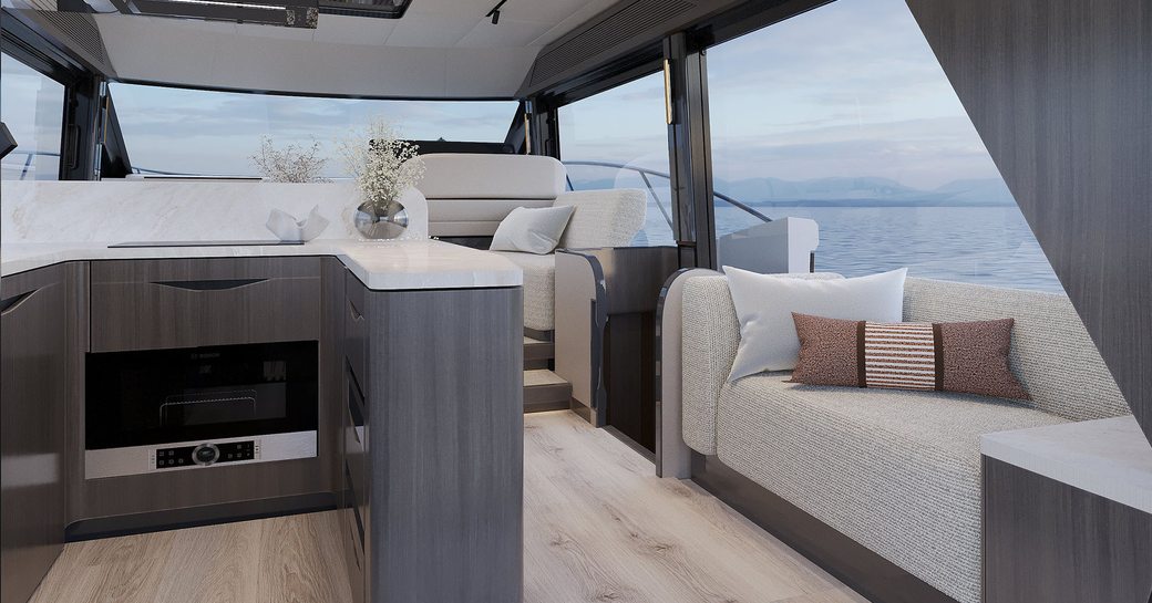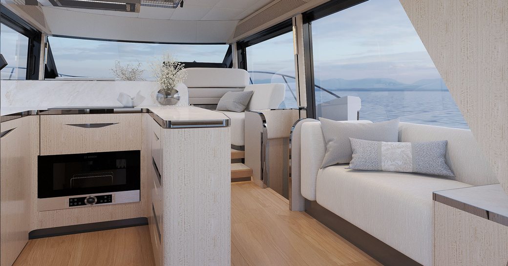 On the main deck, the galley and dining area form an open-plan living space with direct cockpit access, prioritizing clear sightlines and easy movement between interior and exterior zones. Large side windows draw in natural light, reinforcing a bright saloon atmosphere and strengthening the connection to the water.