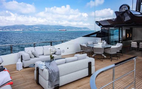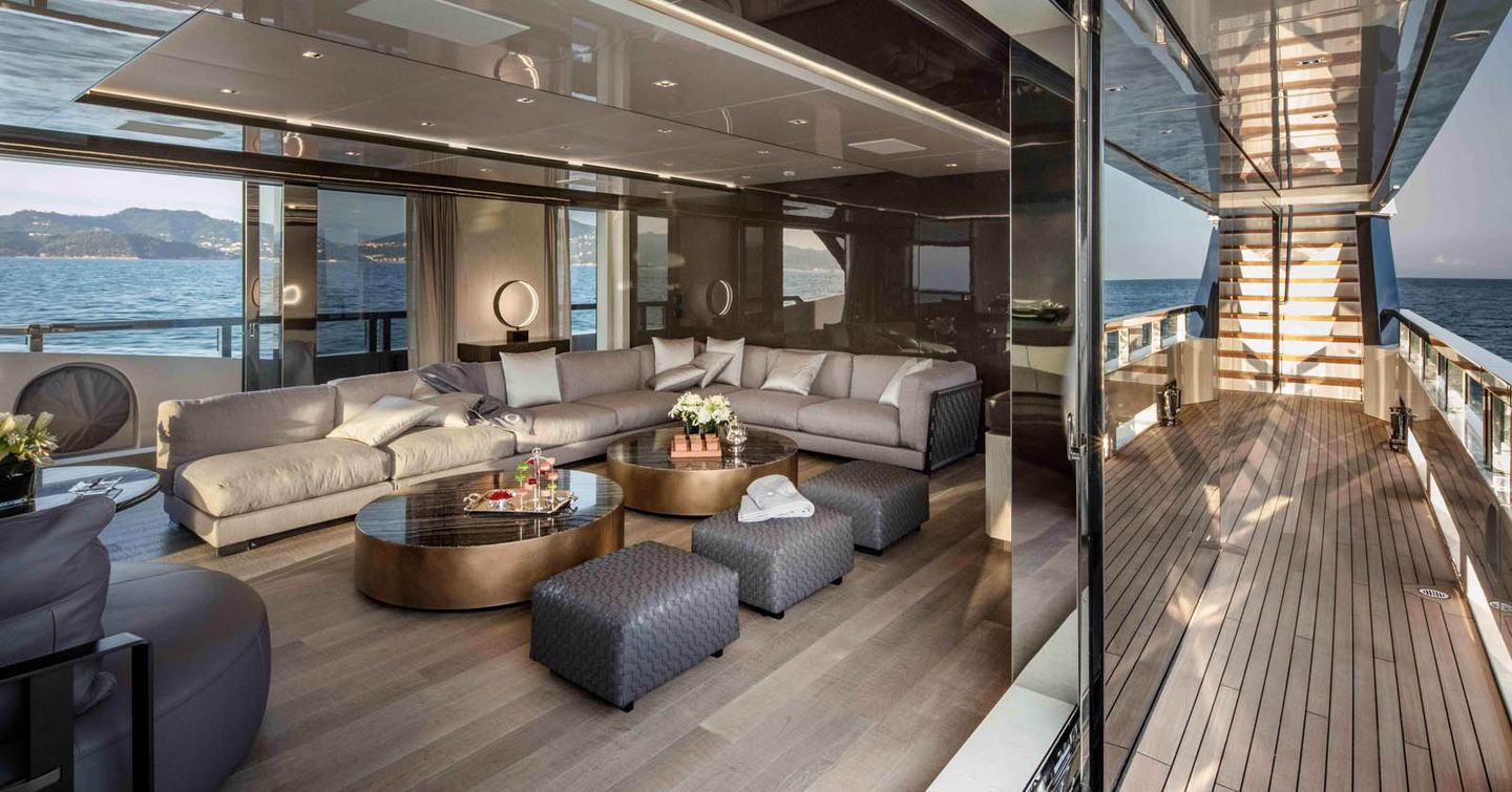 Aft, the cockpit is arranged symmetrically around a central passage leading down toward the water. This layout feels more superyacht-led than purely functional, with generous loose furniture and lighting integrated into the overhead structure. Side decks appear wide and sheltered, with glass inserts opening views out to sea, suggesting they are intended for regular guest circulation underway.